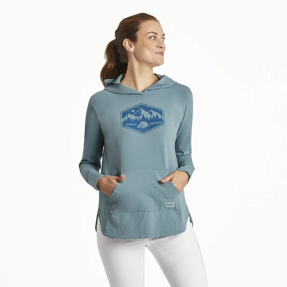 - Tunic length with hood, self-fabric cuffs, kangaroo pocket and rounded hi-lo hem