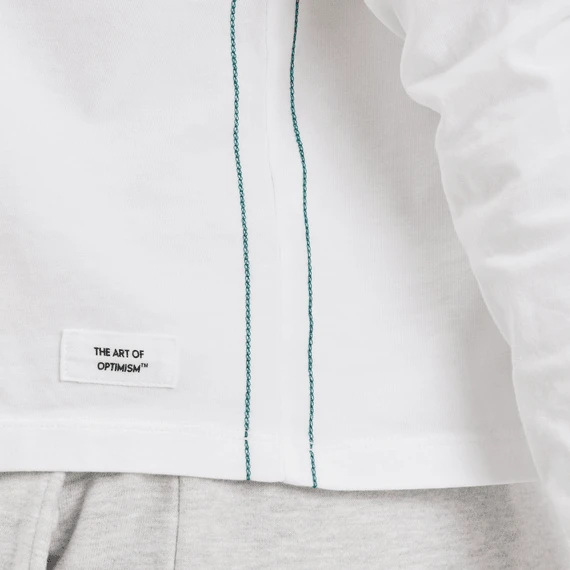 - Relaxed boxy fit with a slight dropped shoulder, cotton/spandex rib at crew neck and cuffs, self-fabric taping inside back neck.