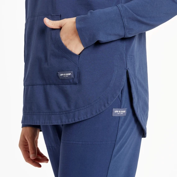 - Tunic length with hood, self-fabric cuffs, kangaroo pocket and rounded hi-lo hem